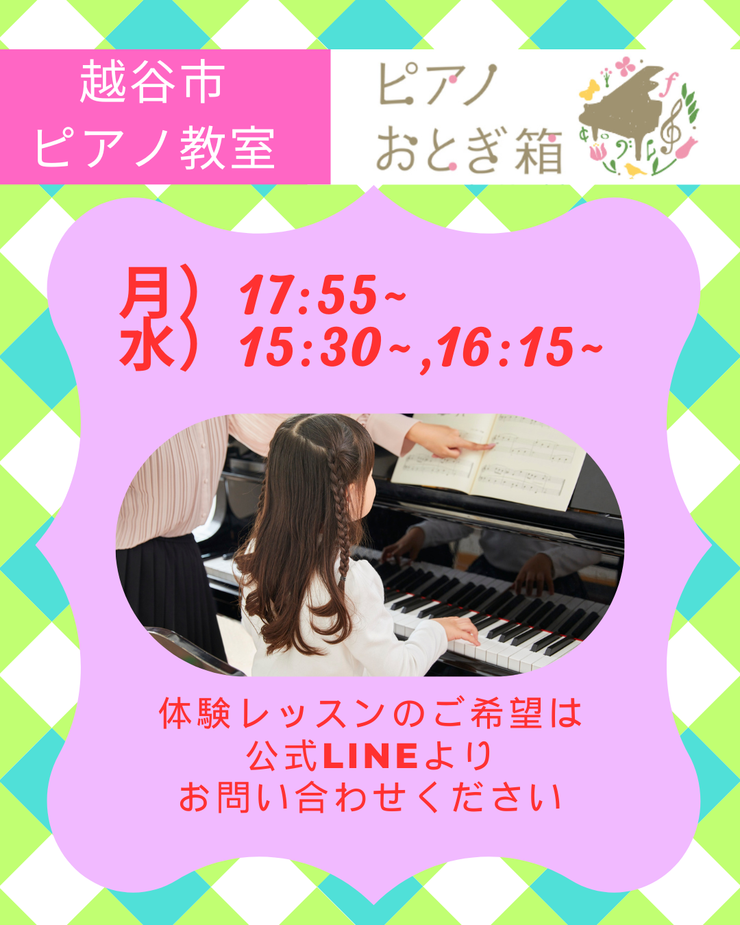 埼玉県越谷市のピアノ教室です。3歳〜シニアまで、幅広い年代の生徒さんが学んでいます。「音楽をしっかり学びたい」「自分の力を伸ばしたい」方に向いている教室です。